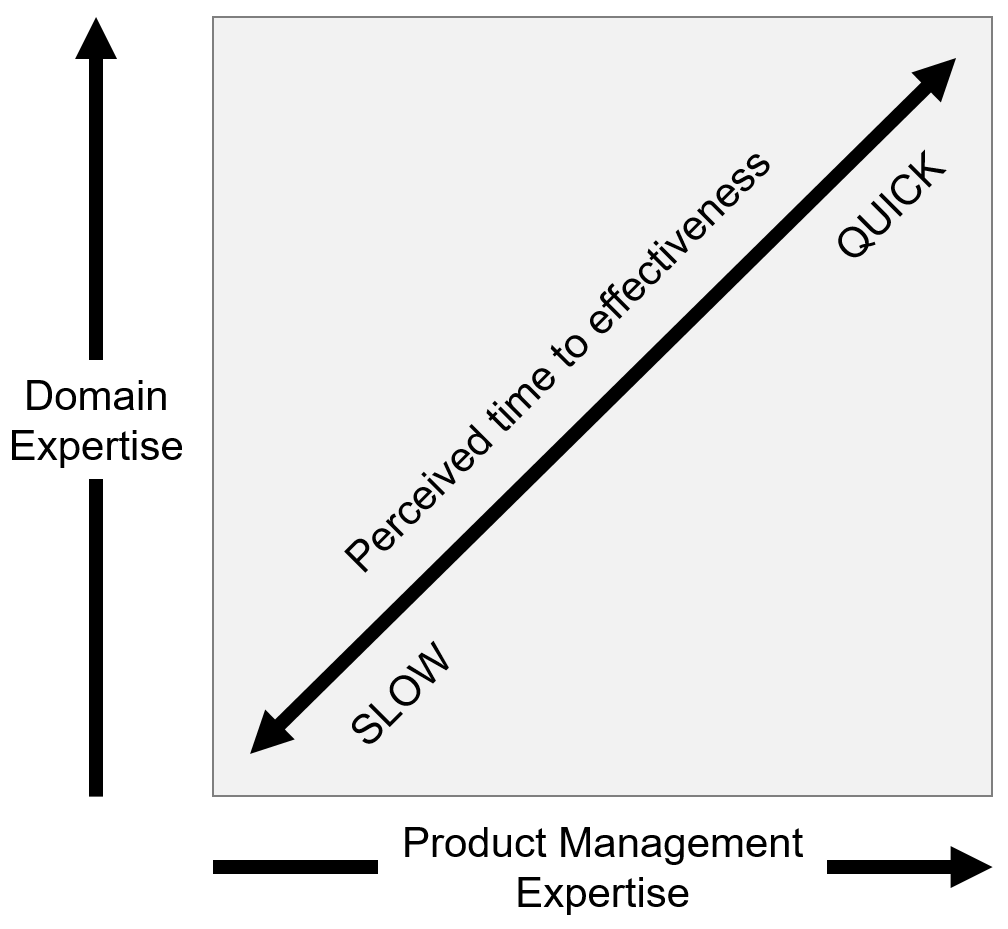 A product manager’s time to effectiveness is a function of her domain expertise in a target industry and functional expertise in product management. Interviewers assign varying importance to each variable based on their perceptions of organizational need and existing capabilities.
